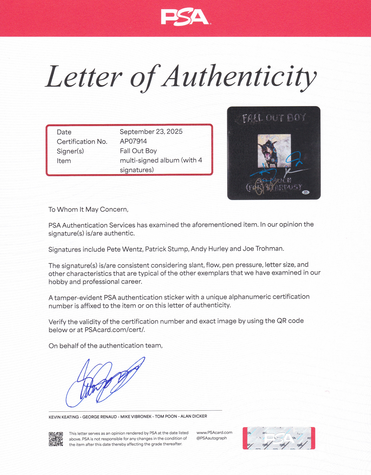 - Entire Band Signed Vinyl. Signatures include: Patrick Stump, Pete Wentz, Joe Trohman and Andy Hurley.
