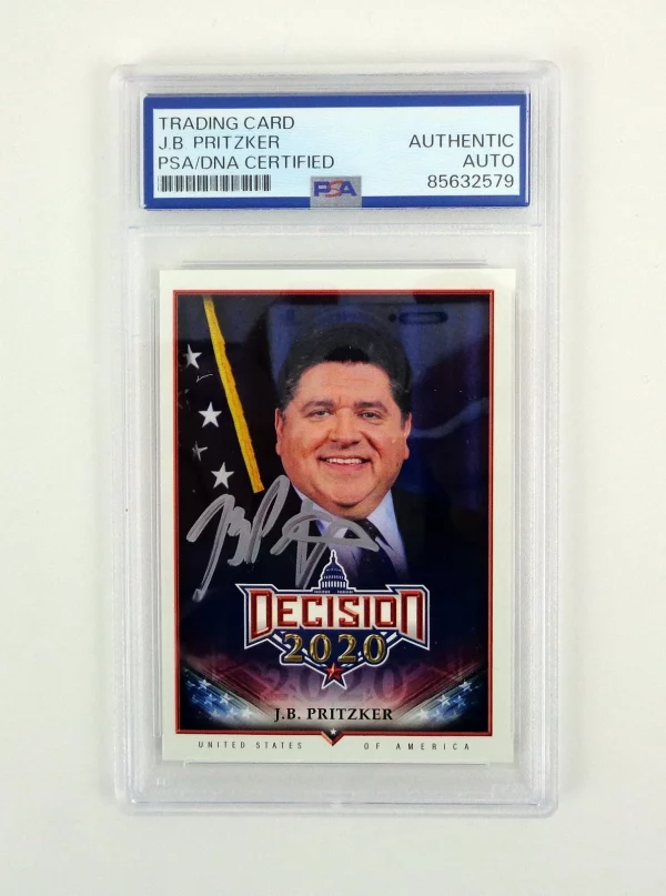 JB Pritzker has emerged as one of the most prominent voices in the Democratic Party; serving as the Governor of Illinois and building a national profile that has positioned him as a leading contender for a future presidential campaign. Pritzker’s combination of executive experience and willingness to engage on the national stage has made him one of the most closely watched political figures in the country; and authenticated memorabilia tied to his rising profile represents an increasingly sought-after category in the political collecting market. This hand signed 2020 Decision baseball card has been authenticated and permanently encapsulated by PSA/DNA in a blue flip for long-term preservation and display.