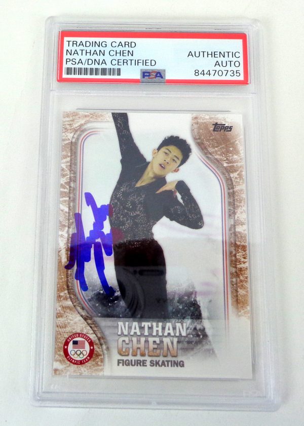 Nathan Chen is one of the most decorated figure skaters in American history; a three-time World Champion and the gold medalist at the 2022 Beijing Winter Olympics. A signed 2018 Topps Olympics rookie card authenticated by PSA/DNA is a meaningful piece of Olympic figure skating card memorabilia.