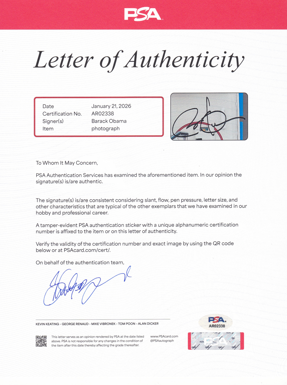 Barack Obama served as the 44th President of the United States from 2009 to 2017; the first African American to hold the office and one of the most historically significant political figures of the 21st century. A signed 8×10 photo authenticated by PSA/DNA with a Full Letter of Authenticity represents the highest level of third-party verification available; a distinction that reflects the premium placed on authenticated Obama signatures in the political memorabilia market.