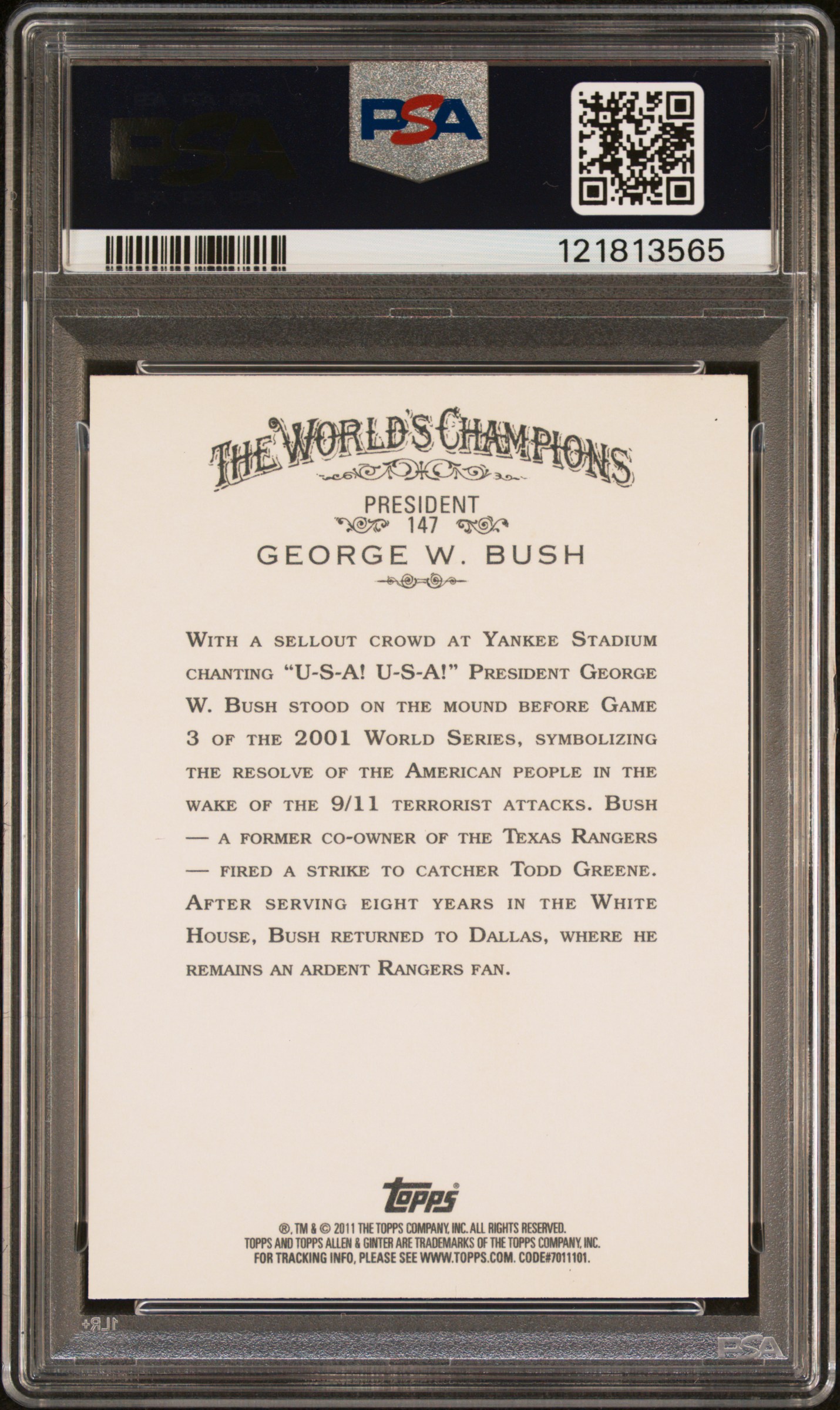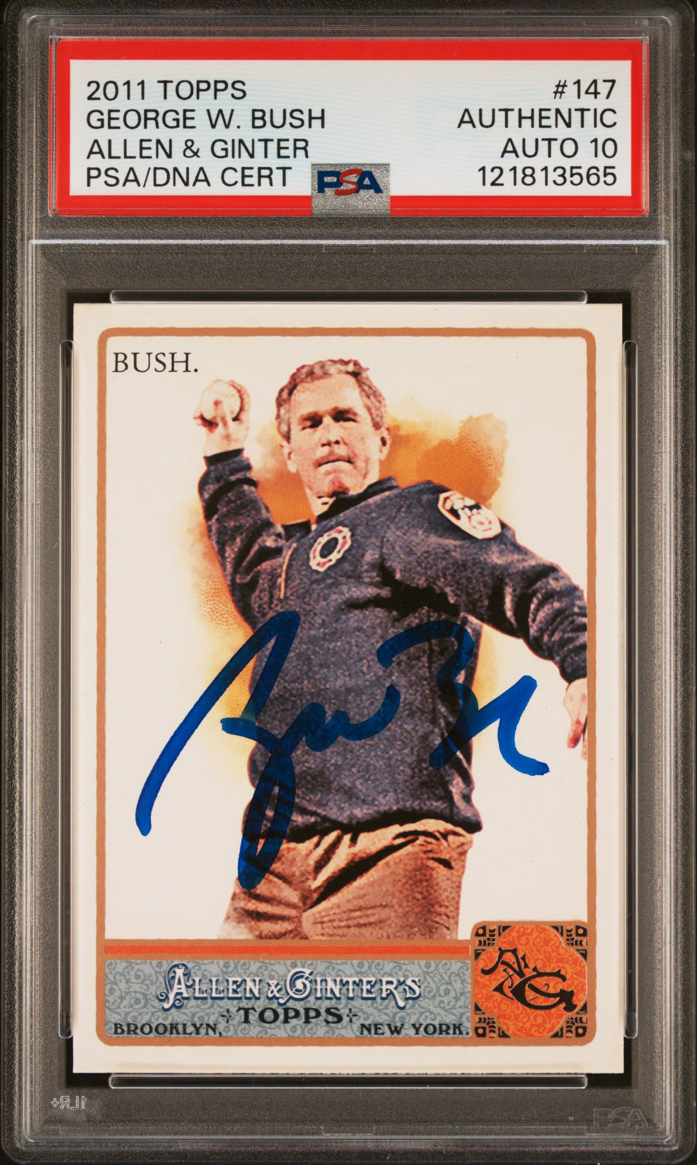 George W. Bush served as the 43rd President of the United States from 2001 to 2009; leading the nation through September 11th, two wars, and some of the most consequential years in modern American history. This PSA/DNA-slabbed 2011 Topps Allen and Ginter card carries his autograph graded Gem Mint 10; the highest possible grade for a signature; making it an elite piece of presidential memorabilia in one of the hobby’s most respected encapsulation formats.